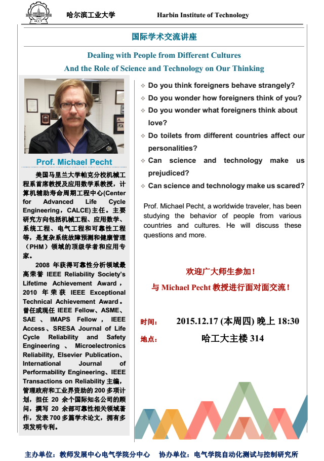 为了鼓励广大师生积极开展国际交流,克服国际交流过程中可能遇到的困难,充分理解和学习在国际学术交流需要关注的问题,积极拓展国际交流视野和渠道,提升国际学术交流能力,依托哈工大教学发展中心电气分中心,受女性自慰 的邀请,美国马里兰大学(University of Maryland)机械工程系首席教授Michael Pecht来我校做特邀报告。