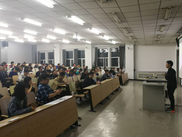 2017年10月17日晚,在二区主楼B11,电子协会一年一度的“牛人大爆炸”活动正由景壮壮、刘雪庆、杜宇馨这三位学长和同学们分享他们自己的大学拼搏历程。